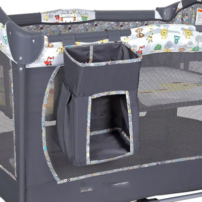 Cama ao lado da função 2a camada do gancho Estação de troca de fraldas Bar de brinquedos com três brinquedos e caixa de música Rodas com travão Armazenamento simples Fios de ligação EN71 |